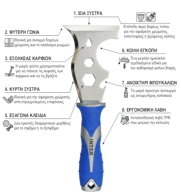 Η σπάτουλα πολλαπλών χρήσεων, πέρα από την κύρια χρήση της για την αφαίρεση μπογιάς, ταπετσαρίας ή επίμονων αρμών, ενσωματώνει λειτουργίες για τον καθαρισμό ρολών βαφής και το άνοιγμα δοχείων, αντικαθιστώτας αποτελεσματικά πολλά εργαλεία μιας χρήσης, καθιστώντας το απαραίτητο εργαλείο για κάθε επαγγελματικό φινίρισμα ή ανακαίνιση.